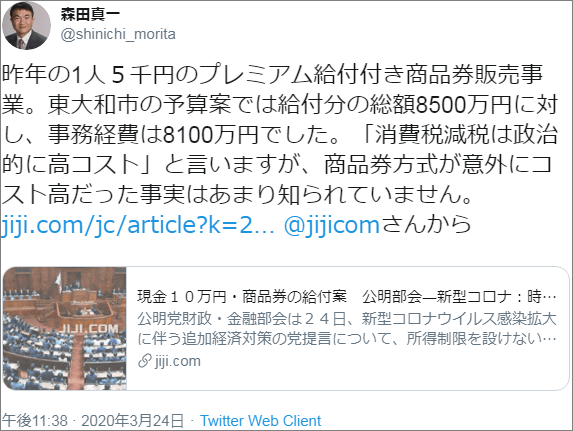 なお、森田真一東大和市議会議員のツイッターによると、昨年全国各地で行われた「プレミアム付き商品券」の場合、東大和市では給付額がトータル8500万円だったのに対し、事務経費は8100万円にのぼったとのこと。