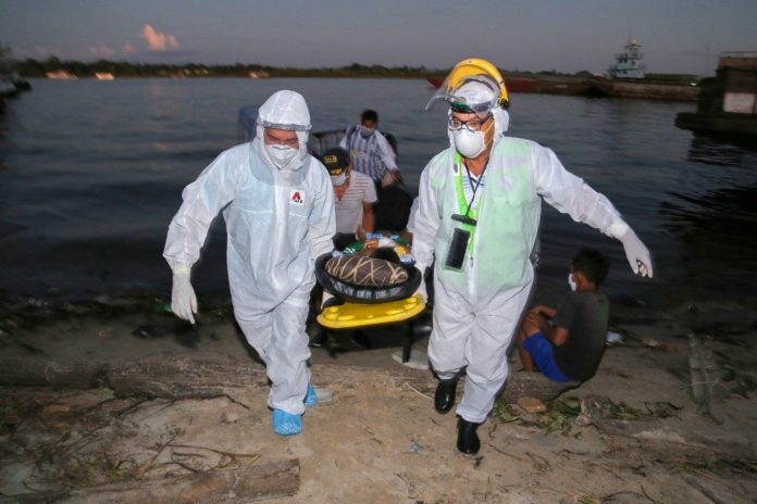 Medical staff carry an 11-year-old COVID-19 patient brought from a nearby community on a boat, at a port in the Amazon River, in Iquitos, Loreto region, Peru, on June 18, 2020. (Photo by Cesar Von BANCELS / AFP)