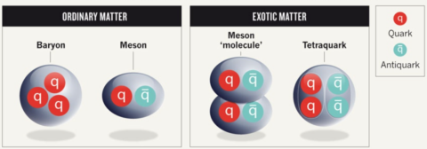 일반적인 물질인 중입자(Baryon)과 중간자(Meson), 그리고 기묘한 물질들인 테트라 쿼크의 두 가지 결합 예상도 ⓒNature