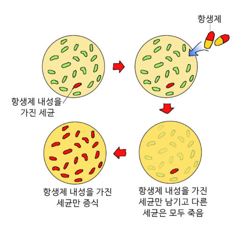 항생제 내성 세균은 돌연변이에 의해 생기는데, 보통 환경에서는 특별히 생존에 유리하지 않지만 항생제가 투여된 환경에서는 압도적으로 증식에 유리하다. ⓒ 윤상석