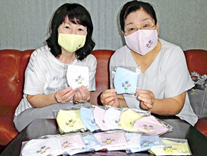 マスクには同女性部のシンボルマークであるハナショウブ、フクジュソウ、ヒメサユリ、カタクリの4種類の花をプリントした。1枚500円で、同女性部の会員事業所で発売中。栢場真弓部長と瓜生ふみえ副部長は「かわいいイラストのマスクができたのでぜひ使ってみてください」と話している。問い合わせは、きたかた商工会女性部(電話0241・27・3202)へ。