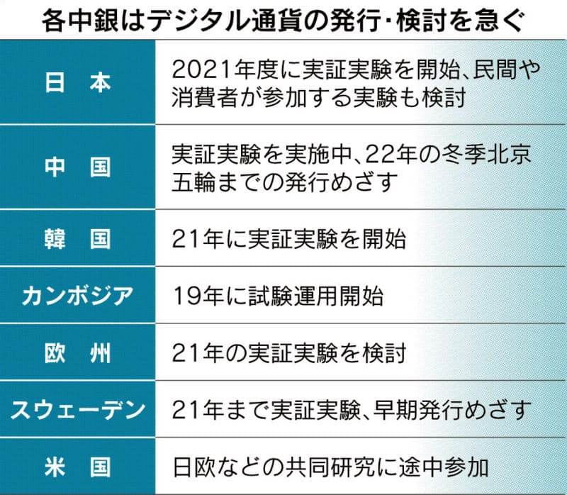 世界で中央銀行が自らデジタル通貨を発行する機運が高まってきた。日銀は9日、実証実験を2021年度に実施すると発表した。日米欧の中銀グループが同日に公表した実際に発行する際の基本原則に沿ったもので、デジタル通貨の準備で先行する中国への警戒感がにじむ。日米欧と中国でデジタル通貨の主導権を巡る争いに発展しつつある。(関連記事総合1面に)