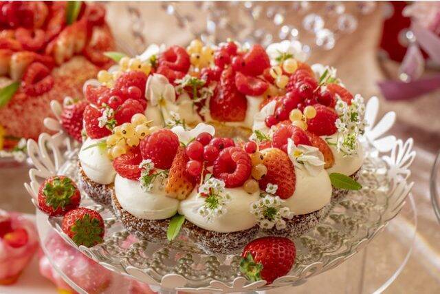 グルテンレスなスペルト小麦粉を使用した「ストロベリー・ブーケ」は、カモミールとはちみつを効かせたアーモンド風味のケーキに生クリームとたっぷりのいちごをトッピング。