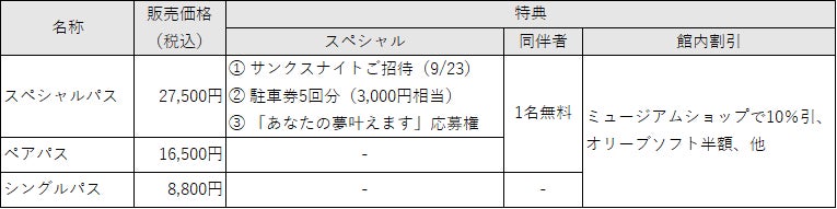 これまでに好評だった館内ミュージアムショップ・飲食店舗での割引はもちろん、「スペシャルパス」の特典では、2020年に販売した「サポーターズパスポート」の特典として好評だった「サンクス・ナイト」へのご招待や「あなたの夢叶えます」を実施いたします。