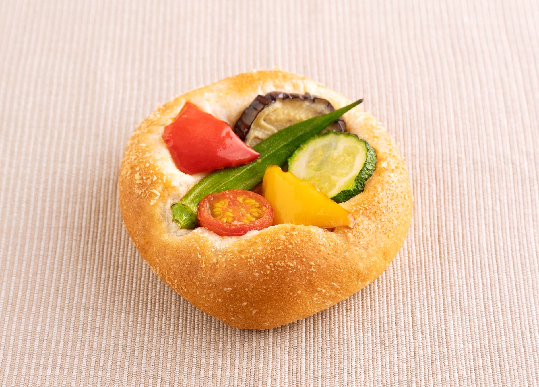 バターチキンカレーパンに彩りの良い5種の夏野菜(トマト・パプリカ・ナス・ズッキーニ・オクラ)をトッピング。マイルドなバターチキンカレーに旬の夏野菜がよく合います!