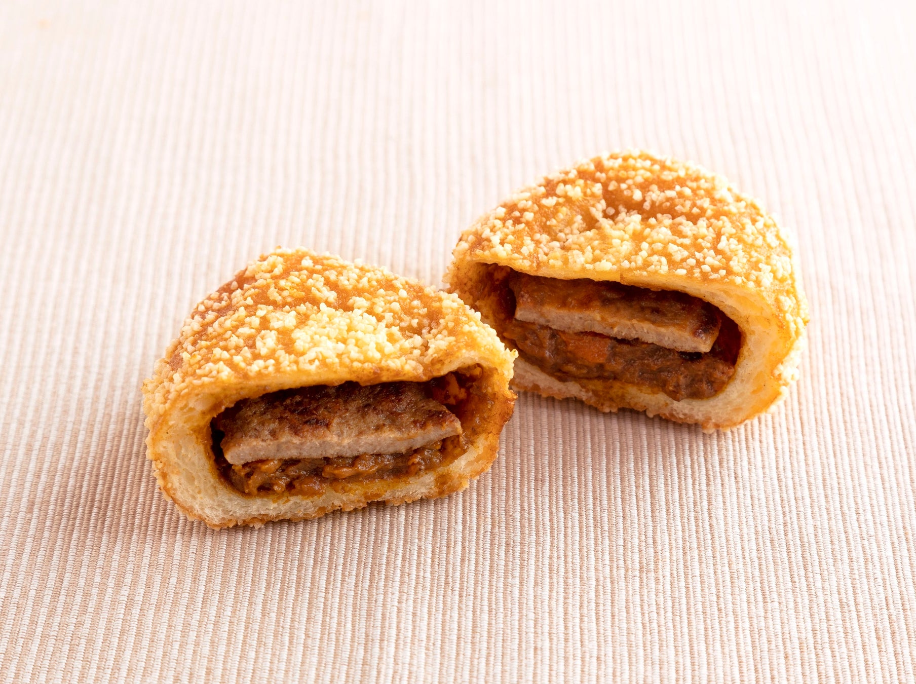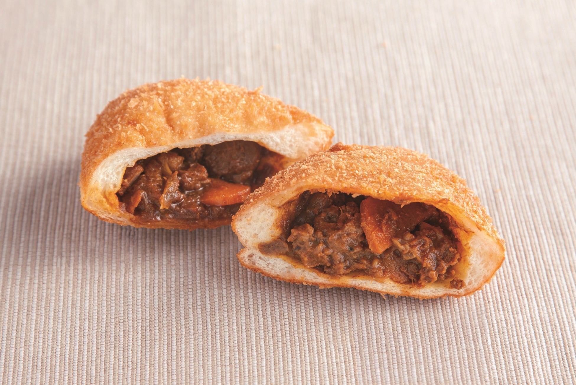 歯切れの良いやわらかいステーキ入りのビーフカレーをザクザクの衣で揚げました。辛さ控えめのカレーとジューシーなステーキがマッチした贅沢なカレーパン。