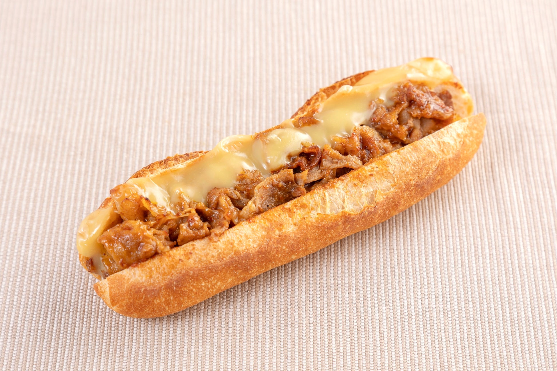 麻辣醤で炒めた豚肉をとろけるチーズと一緒にパリパリのパンにサンドした韓国風フランスパン。マイルドなチーズのあとから来る麻辣醤のピリッとした辛さがくせになります!