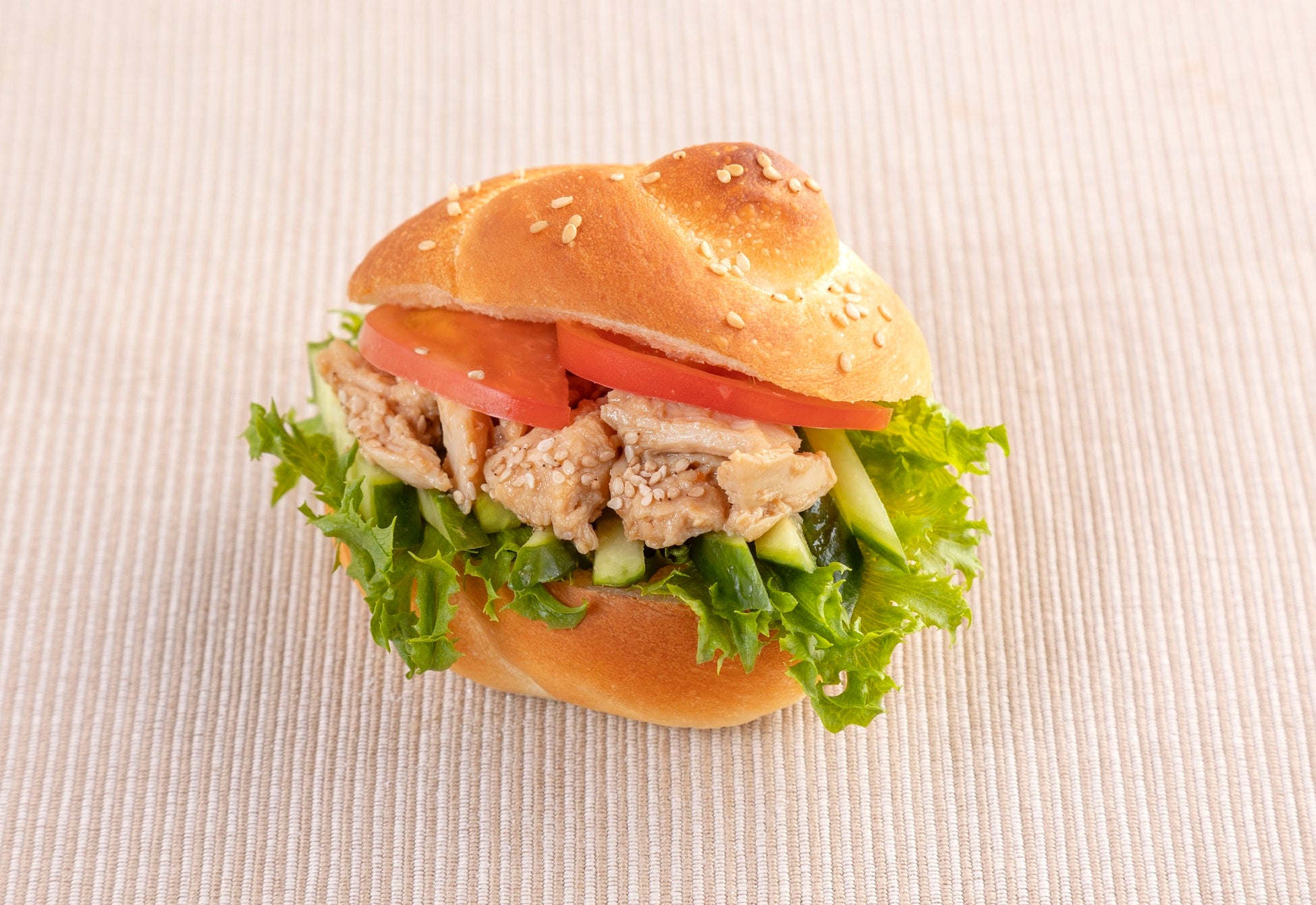 キュウリをたっぷり使った夏の定番「棒棒鶏」をトマト・キャベツと一緒にふわふわのバンズでサンド。暑い日にもさっぱりと食べられるヘルシーバーガー!