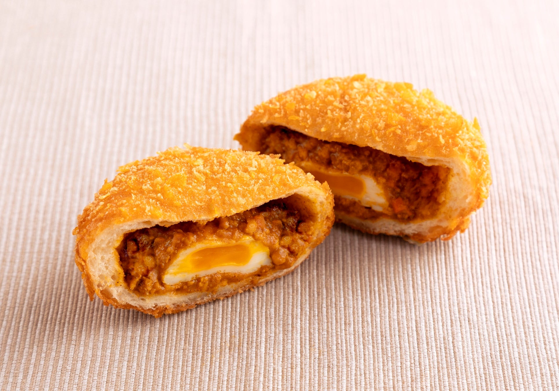 ちょっぴりスパイシーなキーマカレーにマイルドな半熟風たまごを合わせ、コーンフレークを混ぜた衣でザクザクに揚げました。