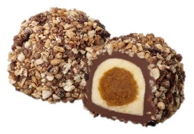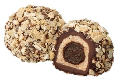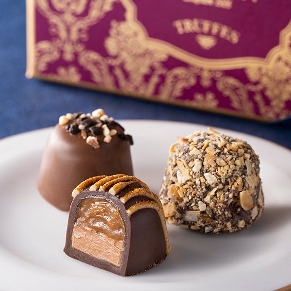 アップル風味のキャラメルガナッシュとヘーゼルナッツのプラリネをダークチョコレートで包み、ミルクチョコレートのラインと ゴールドのグリッターで飾った『タルト タタン』や、くるみとヘーゼルナッツの粒が入ったダークチョコレートクリームに、カカオの香りが豊かに広がるなめらかなダークチョコレートソースを重ね、ミルク&ダークチョコレートで包んだ『ブラウニー』、 グランマルニエの風味が香る、さくさくとした食感のフィユティーヌを加えたアーモンドペーストに、オレンジガナッシュを重ね、ダークチョコレートで包んだ『クレープ シュゼット』など6種類の限定トリュフが登場します。