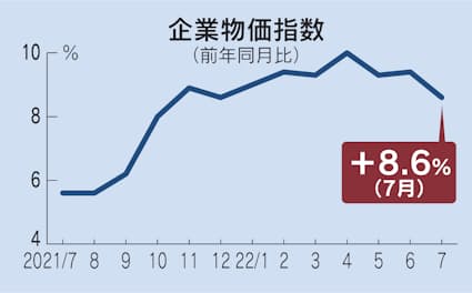 日銀が10日発表した7月の企業物価指数(速報値、2020年平均=100)は114.5と、前年同月比8.6%上昇した。前年の水準を上回るのは17カ月連続。6月の上昇率(9.4%)からは鈍化したが、1980年12月以来の高い伸びが続く。ロシアによるウクライナ侵攻に伴う供給制約への懸念で原材料価格が高止まりし、円安が拍車をかける構図だ。