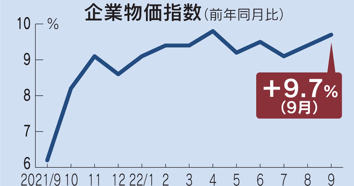 からの記事と詳細 ( 企業物価指数9.7%上昇 9月、民間予想を大きく上回る - 日本経済新聞 )
