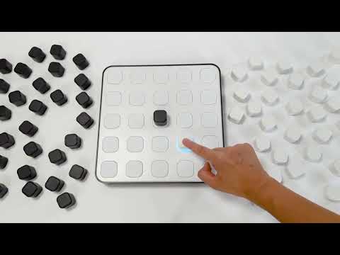 常に人間からスタートします。色はどちらでも構いません。16箇所のどこかに自分のスマートブロックを置き、ボタンを押すようにスマートブロックを指で押さえれば、スマートボード が認識します。するとAI(人工知能)がすぐさま判断し、ロボットのスマートブロックを置く場所をライトの点滅させて知らせます。プレイヤーは、ロボットのスマートブロックを置いてください。そして、あなたの番と続きます。
