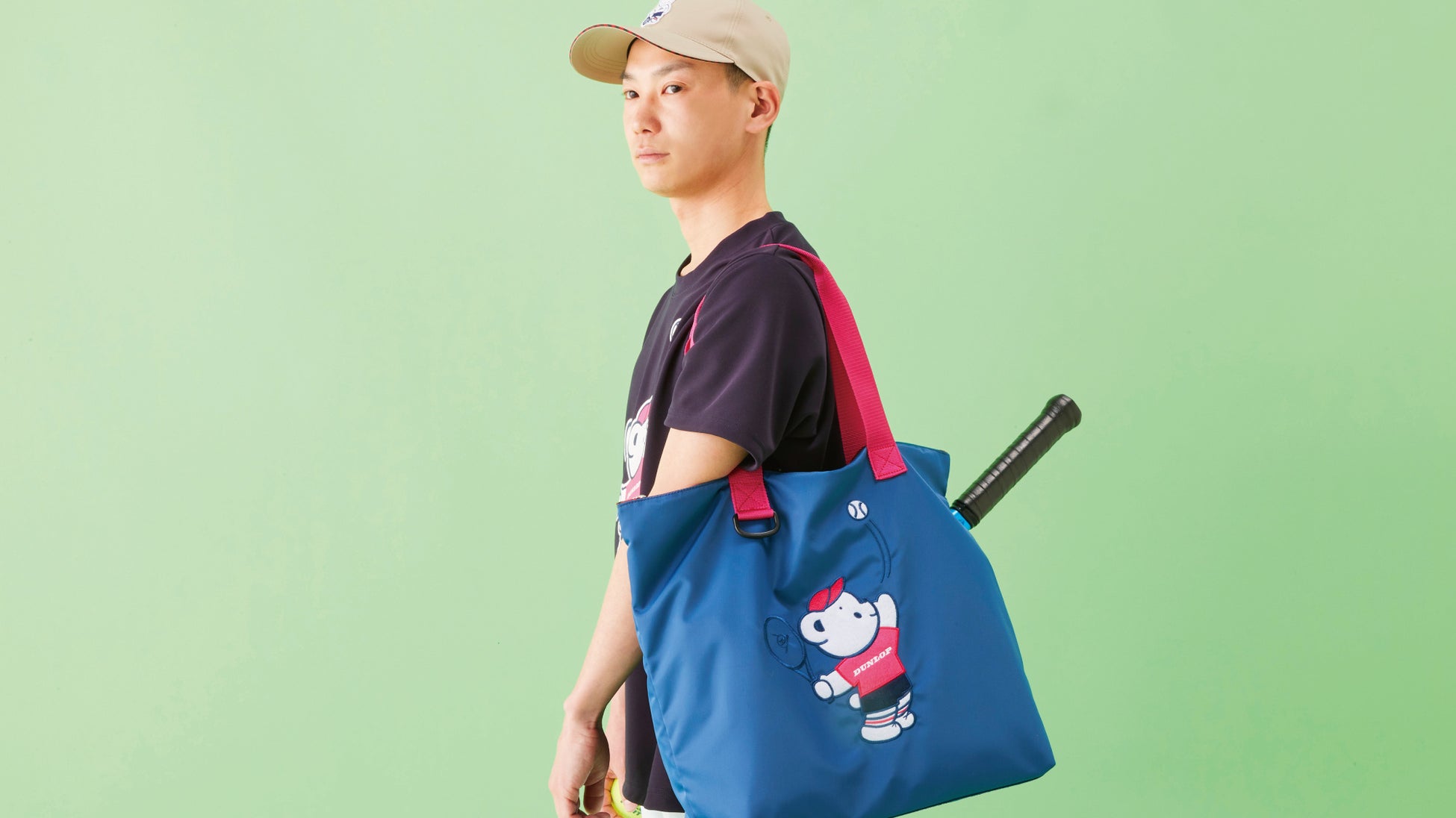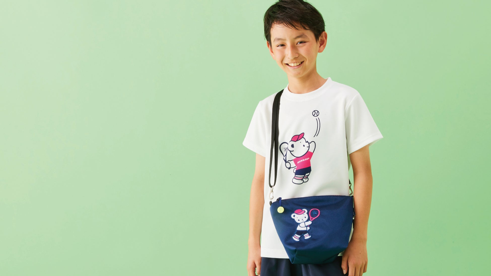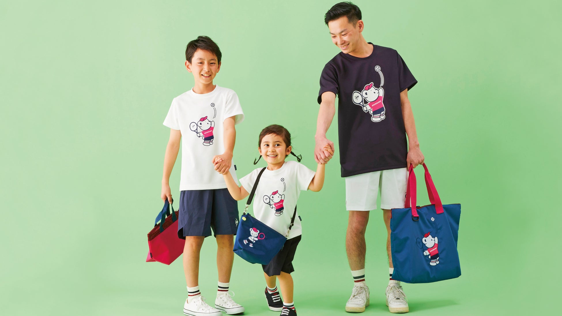 Tシャツは、100~140㎝、大人向けのS・M・Lと幅広いサイズ展開で、親子のリンクコーデをお楽 しみいただけます。ポシェットは、ファスナーを開け閉めするたびにボールを打っているように見え る遊び心溢れるデザインです。