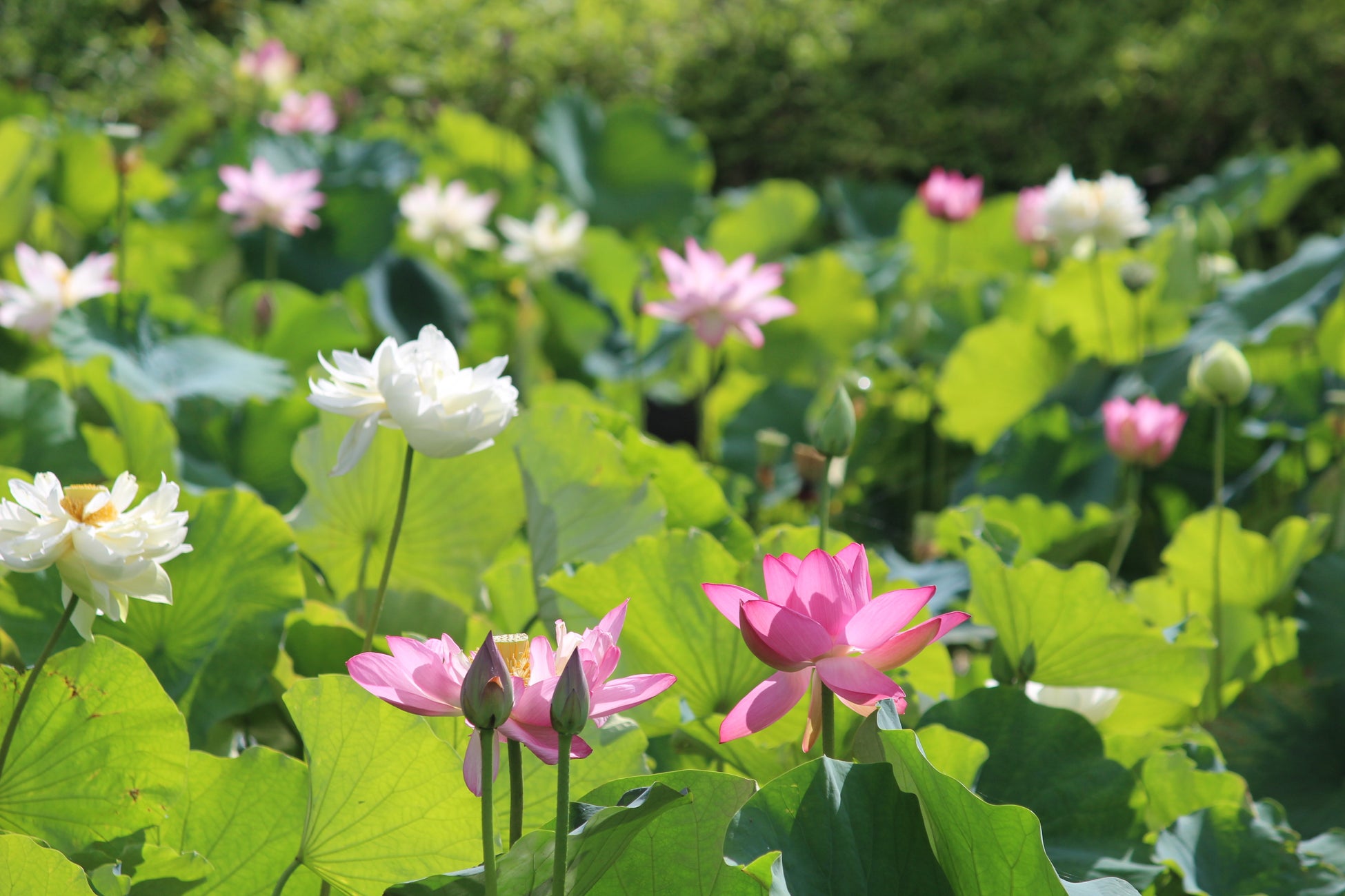 園内には約100種類のハスがあり、早いものは6月下旬から咲き始め、遅いものは8月下旬まで開花します。古代ハスとして有名な大賀ハスは、早生で例年7月上旬頃に開花します。